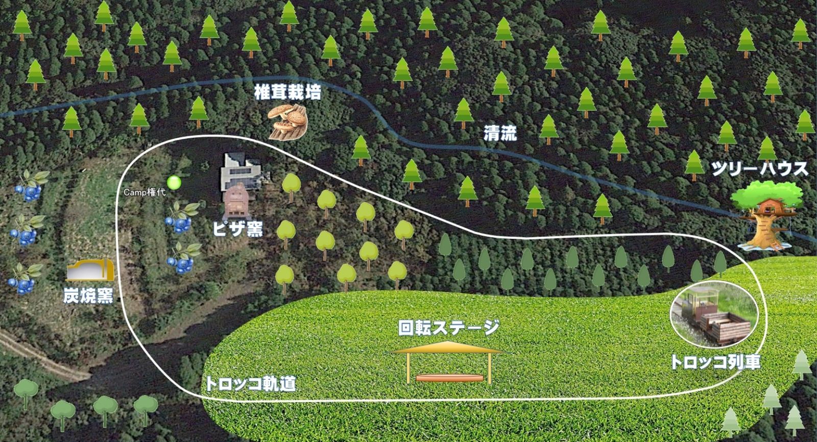 全域がパワースポットとなるCamp権代のウッドハウスを取り巻くエリアのうち、ツリーハウスを立てる予定の大木、平成30年秋に杉を伐採した跡地に設置する東屋根付きの回転ステージ、そこを周回するトロッコ列車などの企画とその他の計画についての概要説明。