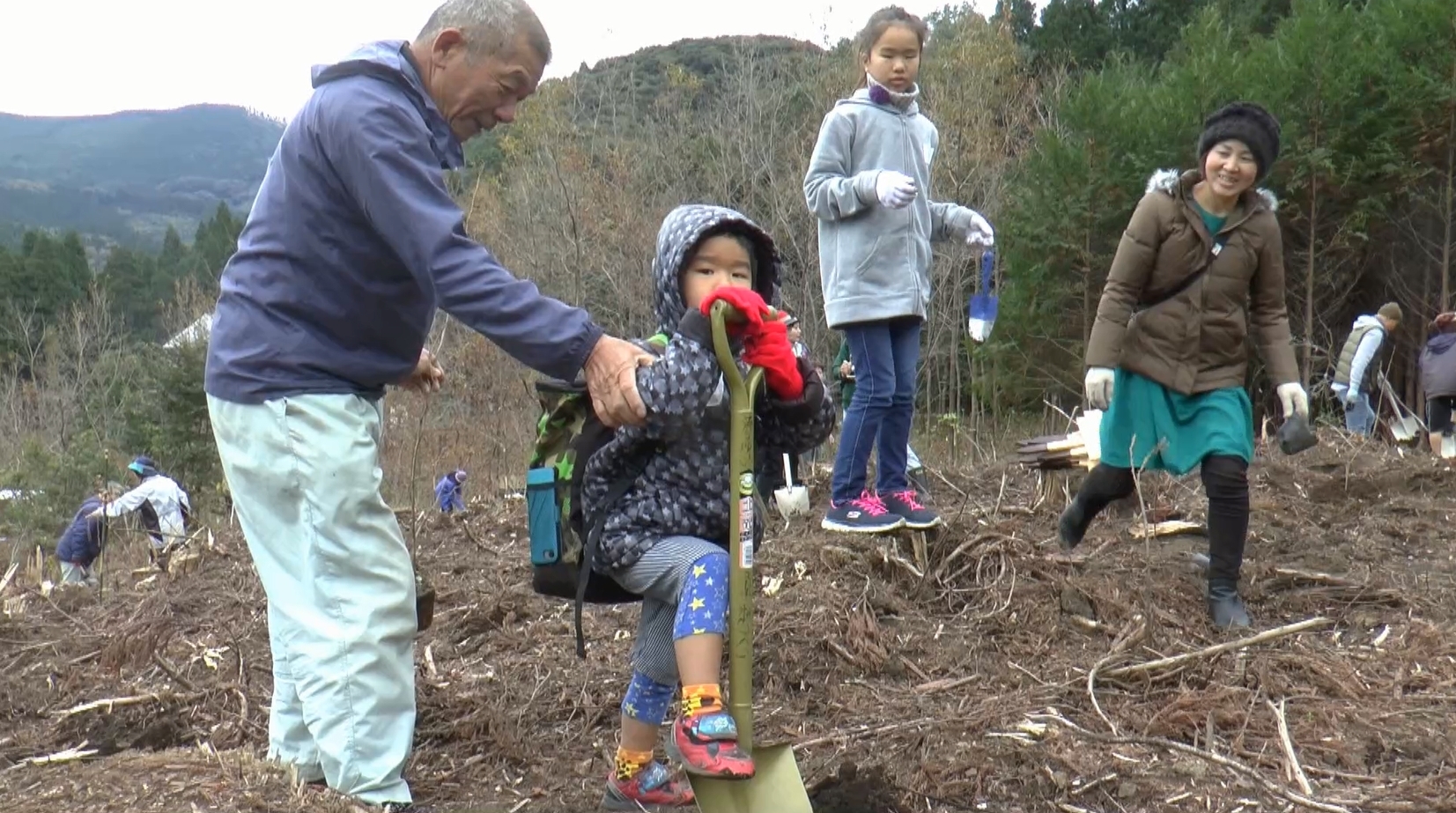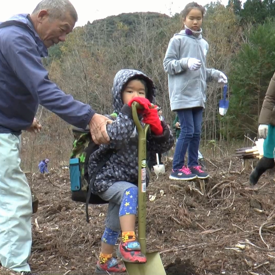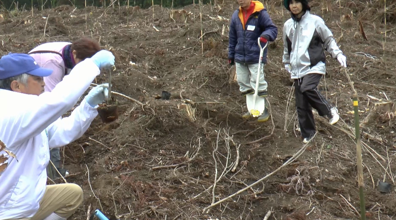 | 植樹 | ●第11回目を迎えた今回の「いのちの森づくり植樹祭」では、伐採したばがりの杉林の跡地に山桜、樫の木、クヌギ、もみじ計200本を植えました。 ●どこを掘っても根っこが多くて結構大変でしたが、小さいお子さんが一緒の家族連れの皆さんやご夫婦で楽しく会話しながら植えて下さいました。 |