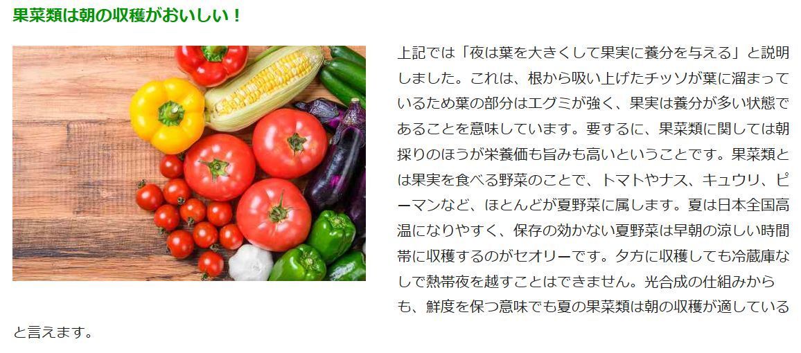 野菜全般、夕方暗くなってから4~5時間かけて光合成で蓄えた養分が株全体に転流し、その後、夜間に根から吸収した肥料分は朝まで葉に蓄積されます。その際果実は先に蓄えられた養分が朝にかけて糖質からアミノ酸に変化していきます。夜間に根から吸い上げられたチッソは葉に溜まることで早朝の葉の部分(葉菜類)はエグミが強くなります。一方、果実(果菜類)は成分移行(変化)により旨味成分が多く蓄えられた状態になります。要するに、葉菜類は夕方に収穫するほうが美味しく、果菜類に関しては朝早く収穫するほうが、みずみずしく栄養価も旨みも高いということが言えます。果菜類とは果実を食べる野菜のことで、トマトやナス、キュウリ、ピーマンなど、ほとんどが夏野菜に属します。光合成の仕組みからも、鮮度を保つ意味でも夏秋の果菜類は朝の収穫が適していると言えます。