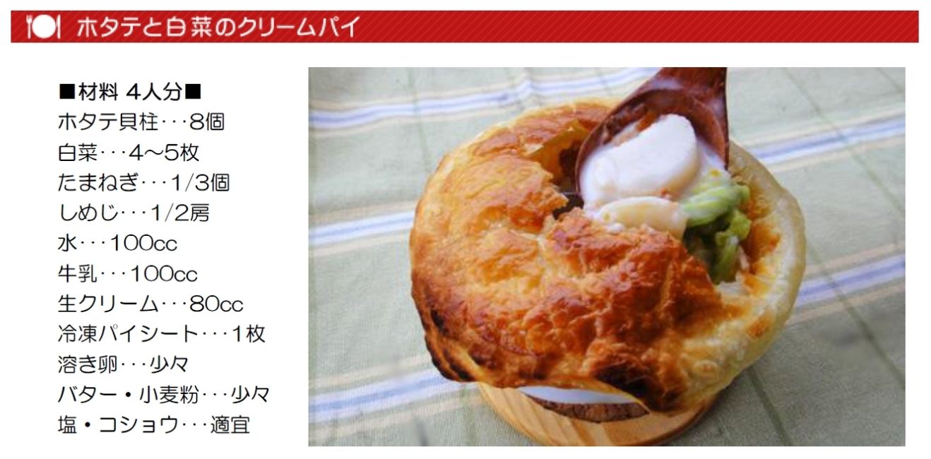 | ホタテと白菜のクリームパイのポイント ・中身はホタテの代わりに鶏肉でもベーコンでもOK ・パイの甘い香りとスプーンを入れる時のサクサクの感触 ・湯気を上げる中のシチューがたまらない ・クリスマスや冬のパーティメニューにぴったり |
