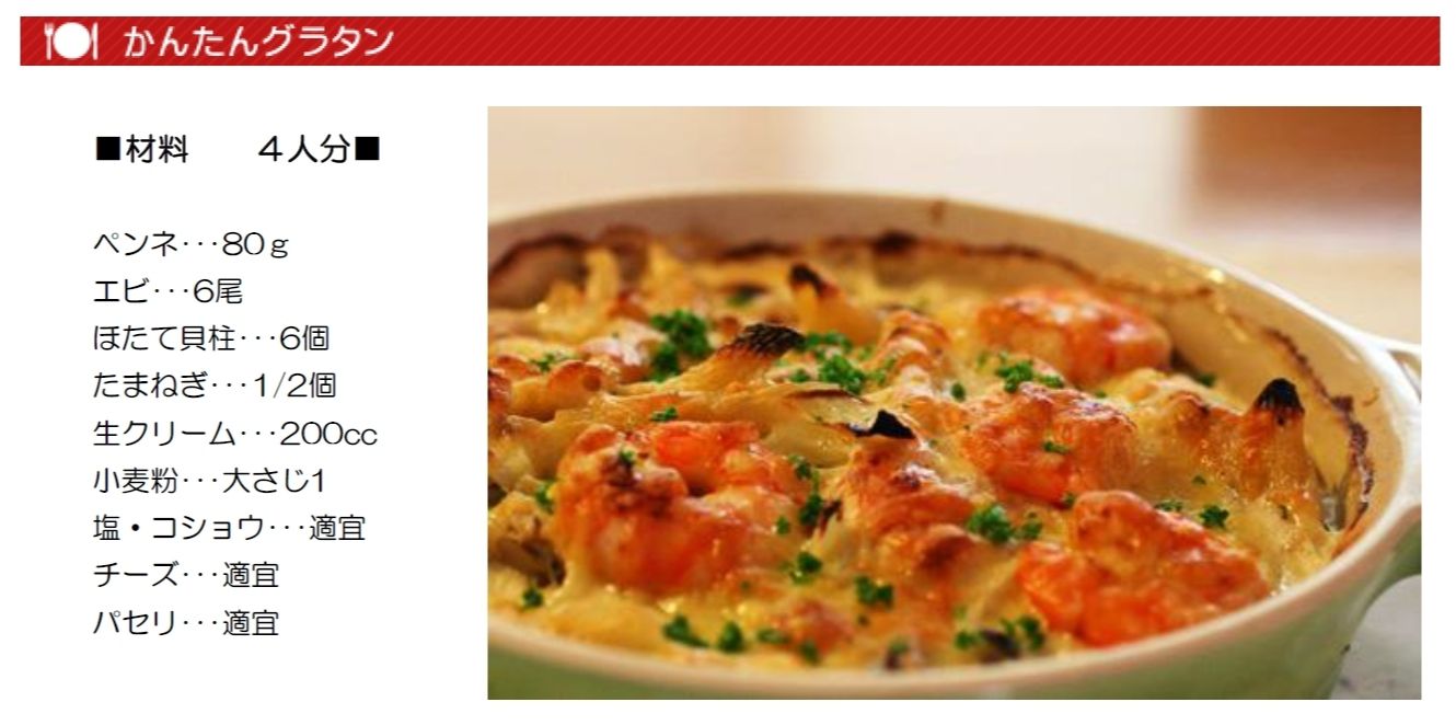 かんたん石窯グラタンのポイント・面倒なホワイトソースを作らず生クリーム使いで濃厚で風味の良いグラタン (缶詰のソースより美味) ・お好みで白ワインを入れて香りをつけてもGOOD! ・鶏肉やベーコン・パスタのかわりに[じゃがいも]でもおいしくできる |