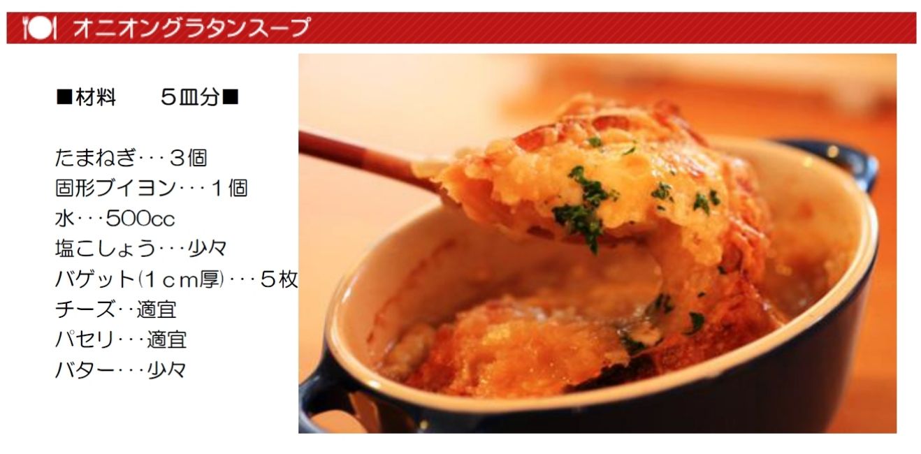| 石窯オニオングラタンスープのポイント ・飴色たまねぎの出来がこの料理のすべて ・冷凍の炒めたまねぎを使うのもアリだが、本格的に炒めるのも楽しい ・ガーリックバターを載せてバゲットに香りをつけてもgood! ・くれぐれも火傷には気をつけて! |