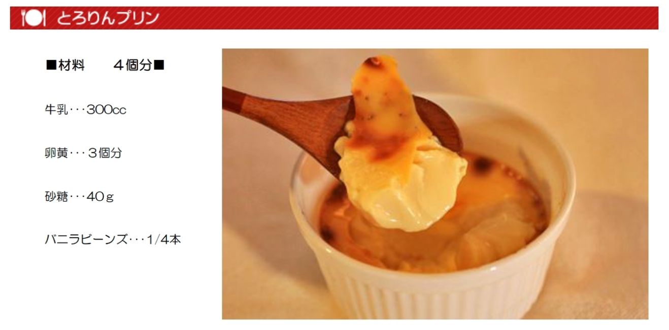 | とろりんプリンのポイント ・バニラビーンズの代わりにエッセンスでもOK! ・焼く前に表面の泡を丁寧に除いておけば 仕上がりが美しい ・高温になる前の窯で焼いて 冷蔵庫で冷やしておくといい ・濃厚な卵の風味と「とろりん」とした仕上がりは驚くほど@@おいしい |