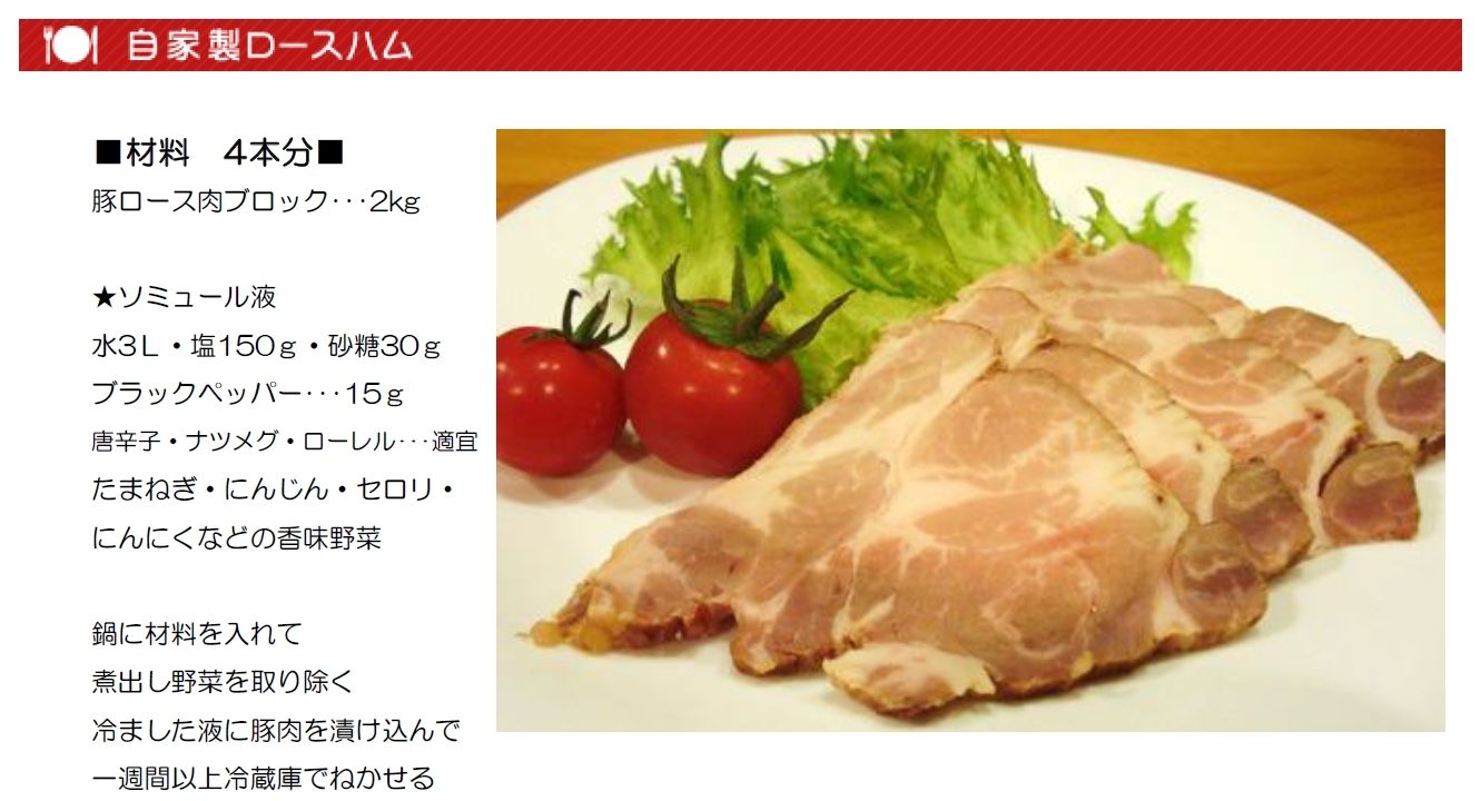 自家製ロースハムのポイント・ソミュール液はベーコンと同じ配合でOK ・ピザパーティの後でゆっくり焼くといいかも(石窯温度を下げる必要がある為) ・豚肉の菌は63℃で死滅する ここをクリアすればそのままスライスしてOK ・オードブルやサラダに 添加物・着色料なしのおいしいハムを召し上がれ! |
